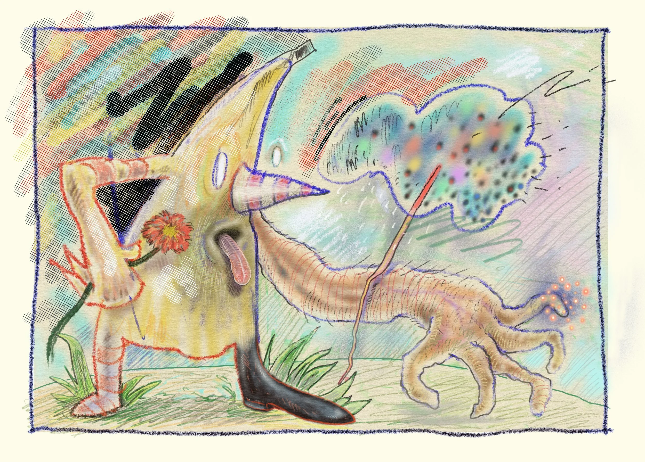 “Having Second Thoughts Several Times a Day” Wood Engraving with Chine Collé and hand colouring.
